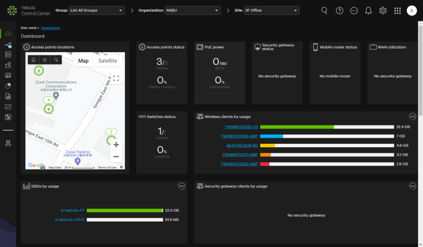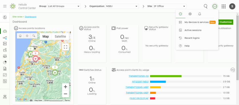Site-wide | Access points / Switches / Security router / Firewall / Security gateway / Mobile router / Accessories | Use this menu to view Nebula Device connection status and traffic summary. |