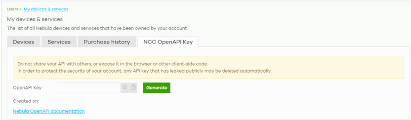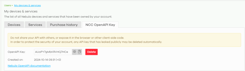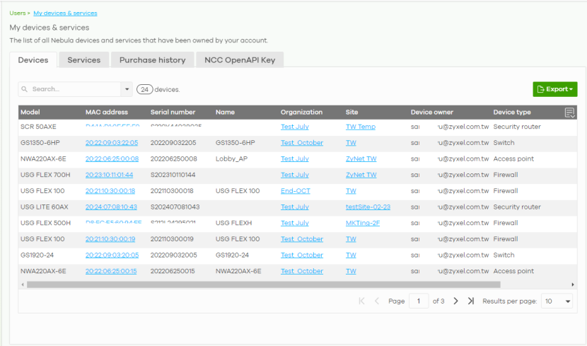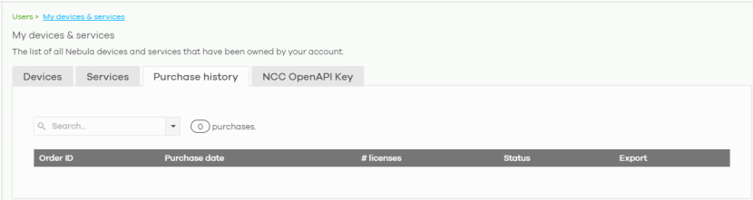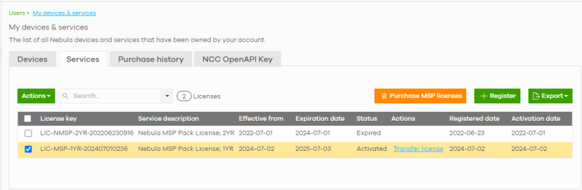 My devices & services | This shows a list of all Nebula Devices in NCC that have your login account as the owner. You can filter the list of Nebula Devices by name, serial number, model, or organization. You can also register licenses to your account, such as an MSP license. |