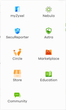 Applications | Click this to open a list of links to different Zyxel sites, such as myZyxel, Nebula, SecuReporter, Astra, Circle, Marketplace, Store, Education, and the Community. |