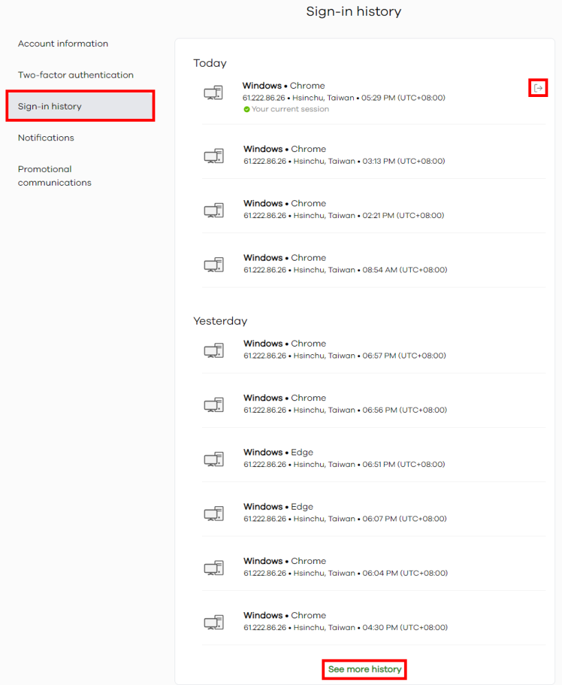 More | Click this to view your account information, login history and active sessions. You can also view your Nebula Devices and manage NCC licenses linked to your account. |