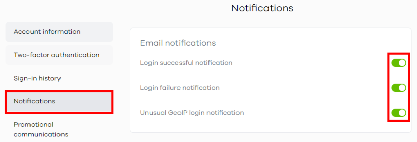 Email notifications | Click the switch to the right to receive an email alert when the following events occur. |