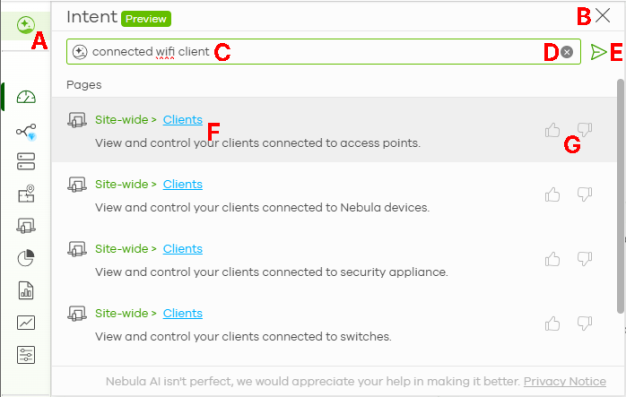 G | Click the thumbs up icon if the AI-generated link is helpful. This increases Nebula AI’s association of your query to the page in NCC. Alternatively, click the thumbs down icon if the AI-generated link is unhelpful. This decreases Nebula AI’s association of your query to the page in NCC. |