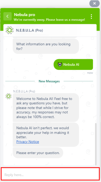 C | Enter your query here. You can enter a complete sentence to search for information instead of a keyword. Press Enter on your keyboard or click the Send button (E) to send your query to Nebula AI. |