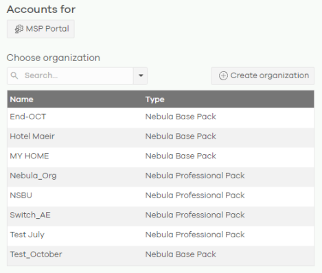 When you have more than one organization on your account, the following screen displays right after you log in. Select the organization you want to manage now, access the MSP Portal or click Create organization to add a new one.