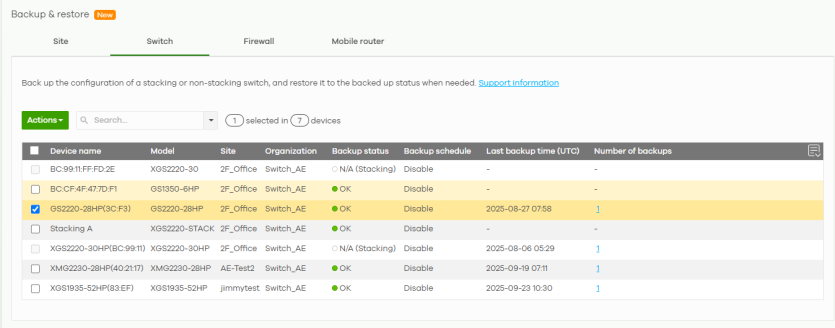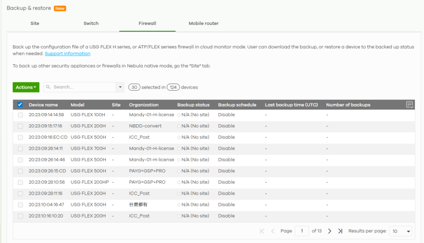 Actions | Click the Create backup button to open the window to create a new backup of the current configuration of the site / Nebula Switch / Nebula Firewall / Nebula Mobile Router to the NCC. Enter 1 to 64 characters including special characters inside the square brackets [~!@#$%^&*()_+{}|:”<>–=[]\;’,/ ] in the Backup description field and then click Backup. Otherwise, click Cancel. The backup time will depend on how many sites / Nebula Switches / Nebula Firewalls / Nebula Mobile Routers are selected and the number of Nebula Devices in the selected sites during the backup. Click the Set backup schedule button to open the window to select a Monthly, Weekly, or Daily backup of the current configuration of the site / Nebula Switch / Nebula Firewall / Nebula Mobile Router to the NCC. Then select the day of the month/week. To activate the schedule, click the Backup schedule switch to the right and then click Update to save the settings and close the window. Otherwise, click Cancel. Click the Restore button to restore a previously saved site / Nebula Switch / Nebula Firewall / Nebula Mobile Router configuration from NCC to the site. |