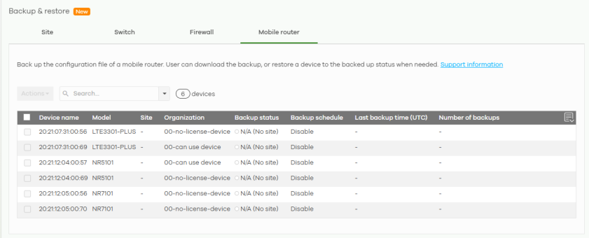 Backup status | This indicates the default or last backup is successful (green), a backup is in progress (orange), a previous backup failed (red), or the Nebula Switch / Nebula Firewall / Nebula Mobile Router does not belong to a site or the Nebula Switch is a stacking member (white). |