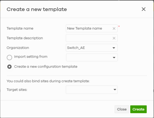 Create | Click this button to create a new configuration template. You can copy settings from an existing site or configuration template, or create a new template with default settings. You do not have to bind templates immediately after creating them. |
