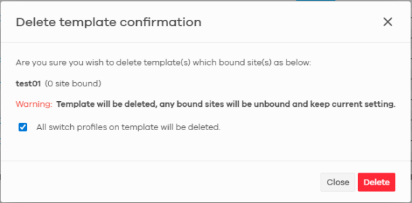 Delete | Click this button to unbind the selected templates. A window pops up asking you to confirm that you want to unbind the templates. If you unbind a template that is being used by a site, the site will be unbound from the template automatically and retain the settings previously applied from the template. |