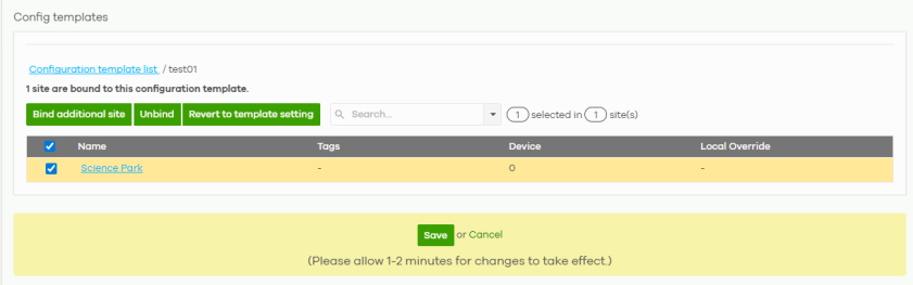 Use this screen to bind or unbind a site from a template. Click an existing template from the list in the MSP > MSP cross-org manage > Config templates screen to access this screen. To go back to the previous screen, click the Configuration templates list link.