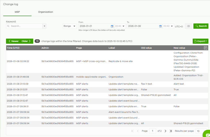 Organization | This field only appears on the Organization tab. Select the organization with Professional Pack or Pay-As-You-Go (PAYG) license to filter the list of log entries. |