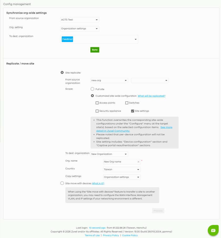 Process | Click this to copy the selected sites including the Nebula Devices from the source to the destination organization. |