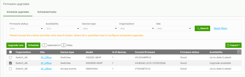 Search | Click this button after specifying your filter criteria in the Firmware status, Availability, Device type, Organization and Site fields. |