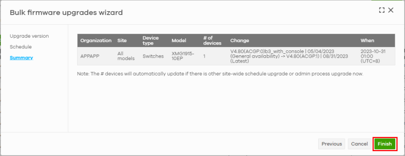 Schedule | Click this to run the wizard to set a specific date and time to upgrade firmware to Nebula Devices in the selected organizations and sites. |
