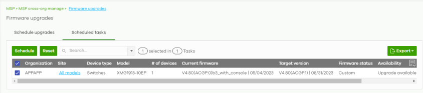 Reset | Select one or more Nebula Devices, and then click Reset to remove the Nebula Devices from the scheduled task list. The Nebula Devices will follow the site-wide firmware management settings. |