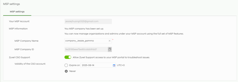 Zyxel CSO support | Click the switch to the right to allow the Zyxel customer support account to access your MSP settings, so that they can help check your configurations and log messages for troubleshooting. |