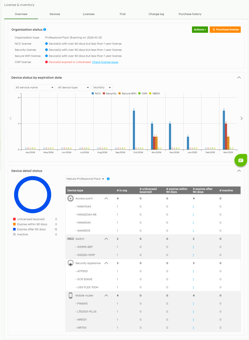 # inactive | This shows the total number of Nebula Devices of the specified category and model that have an NCC Pro or Plus license that has not been activated. |