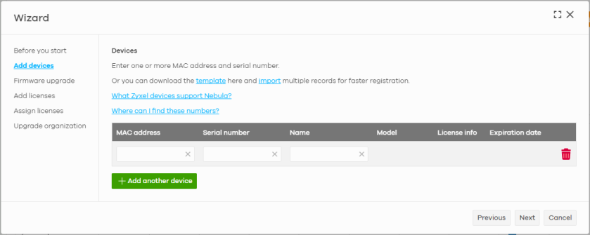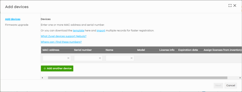 template | Click this to download an XLSX file that you can use as a template to import a large number of Nebula Devices at once. Follow the instructions and formatting in the template to add the Nebula Device’s serial numbers and MAC addresses. |