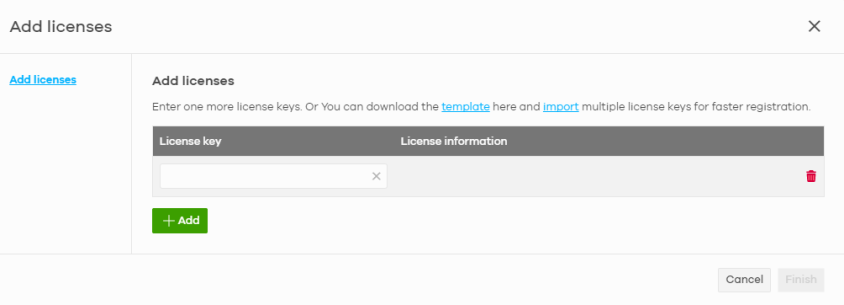 template | Click this to download an XLSX file that you can use as a template to import a large number of licenses at once. Follow the instructions and formatting in the template to add the license keys. |