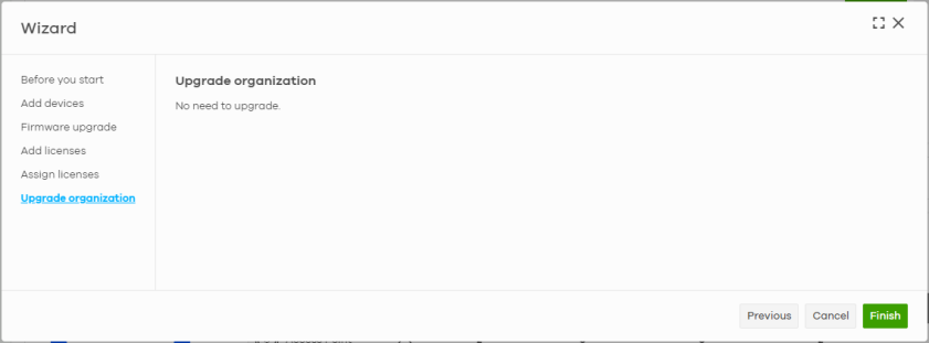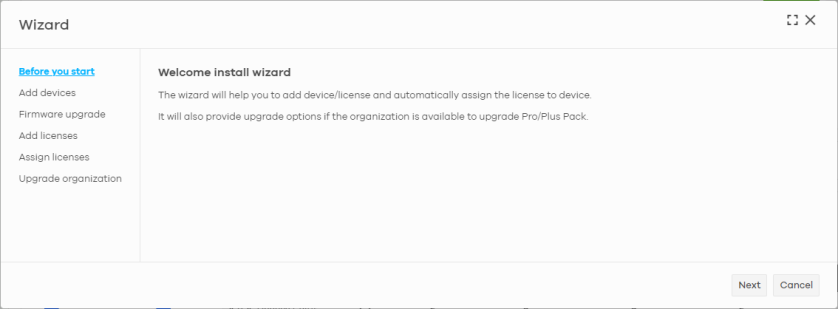Actions | Click this button to add licenses and/or Nebula Devices to the organization. Choose one of the following actions: • Add more devices: Add new Nebula Devices to the organization, by serial number and MAC address. For details, see Add Devices Screen. • Add more licenses: Add new licenses to the organization, by license key. For details, see Add Licenses Screen. • Install wizard: Add Nebula Devices and licenses to the organization, assign the licenses to the Nebula Devices, and then upgrade the organization if required. For details, see Install Wizard. |