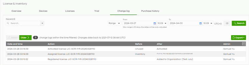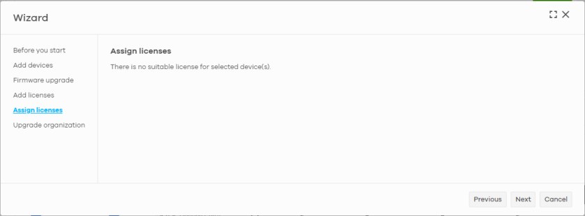 Action | Click this button to perform the following actions: Change organization: Moves the selected licenses to an organization. The organizations must have the same owners. Assign License: Assign the selected licenses to one or more Nebula Devices. Only the licenses applicable for the Nebula Device can be selected. Undo assign: Unlink the inactive licenses from the associated Nebula Devices. After unlinking, the license will be categorized as unused in Inventory. An inactive license is a license that has been assigned to a Nebula Device but is not yet in use or queued. Transfer license: Moves the unused licenses linked to a Nebula Device to another Nebula Device. The Nebula Devices can be in the same organization or in a different organization. The Nebula Devices must have the same owner. Bundled, Trial, and Promotion licenses cannot be transferred. |