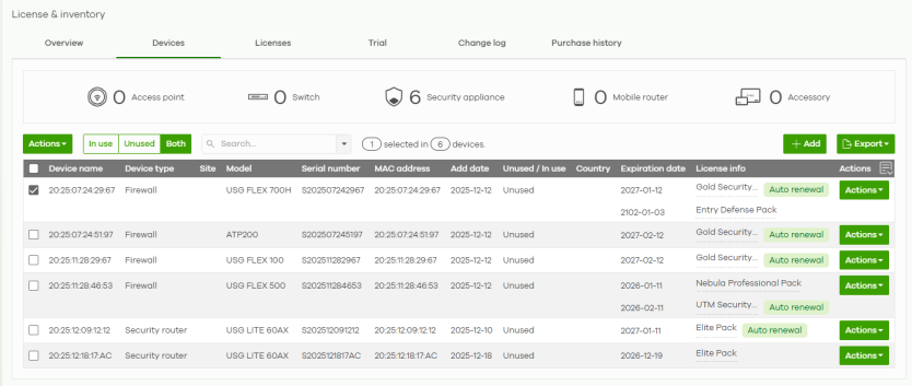 Actions | Select one or more Nebula Devices and then click this button to perform one of the following actions: Change organization: Moves the Nebula Device to an organization. The organizations must have the same owners. Change site assignment: Moves the selected Nebula Devices to a site, or remove them from their current site while leaving them in the organization. Remove from organization: Remove the Nebula Devices from NCC. You can manage the Nebula Devices in standalone mode, or re-add them to NCC later. Assign license: Assign licenses to the selected Nebula Devices. Undo assign: Unlink the inactive licenses from the associated Nebula Devices. After unlinking, the license will be categorized as unused in Inventory. An inactive license is a license that has been assigned to a Nebula Device but is not yet in use or queued. Transfer license: Moves the unused licenses linked to a Nebula Device to another Nebula Device. Nebula Devices can be in the same organization or in a different organization. The Nebula Devices must have the same owner. Bundled, Trial, and Promotion licenses cannot be transferred. Purchase license: Select what license to purchase and target expiration date to keep the Pro/Plus tier features/services running. You may export the list of required licenses to your computer. Then click the Zyxel license marketplace (Check out) button to complete your purchase. Unused licenses assigned to your organization will not count as it is not yet assigned to a Nebula Device. This button is available only for the Organization (Delegated) or Owner administrator account with a registered Nebula Device(s). |