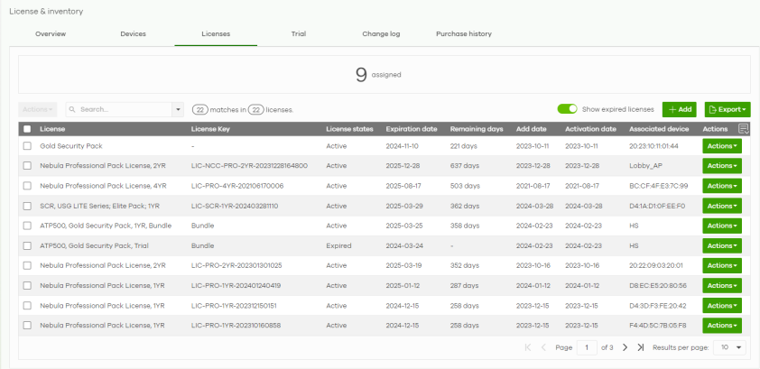 Actions | Select one or more Nebula Devices and then click this button to perform one of the following actions: Change organization: Moves the selected licenses to an organization. The organizations must have the same owners. Assign License: Assign the selected licenses to one or more Nebula Devices. Only the licenses applicable for the Nebula Device can be selected. Undo assign: Unlink the inactive licenses from the associated Nebula Devices. After unlinking, the license will be categorized as unused in Inventory. An inactive license is a license that has been assigned to a Nebula Device but is not yet in use or queued. Transfer license: Moves the unused licenses linked to a Nebula Device to another Nebula Device. The Nebula Devices can be in the same organization or in a different organization. The Nebula Devices must have the same owner. Bundled, Trial, and Promotion licenses cannot be transferred. |