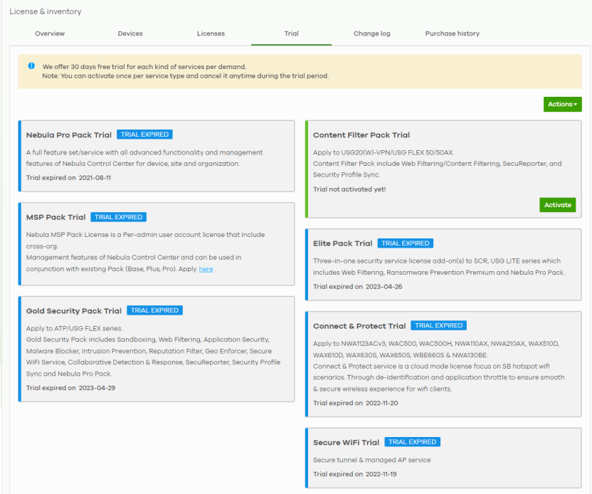 (Status) | The status displays next to the name of a trial license. If no status displays, it means you can activate the trial license. The trial license can be used on the Nebula Devices within the organization. Click Activate to start using the services of the trial license. |