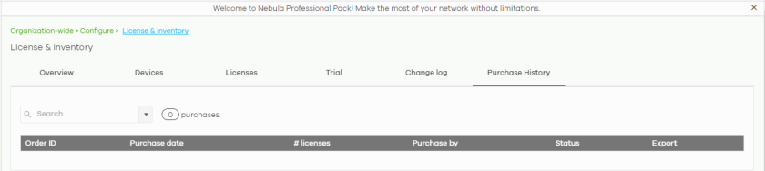 N unused (Pro Pack, 1MO/1YR/2YR/4YR/7YR) or N unused (Plus Pack, 1MO/1YR/2YR) | This shows the total number of Nebula Professional Pack or Nebula Plus Pack licenses (N) in the organization that are not assigned to a Nebula Device. |