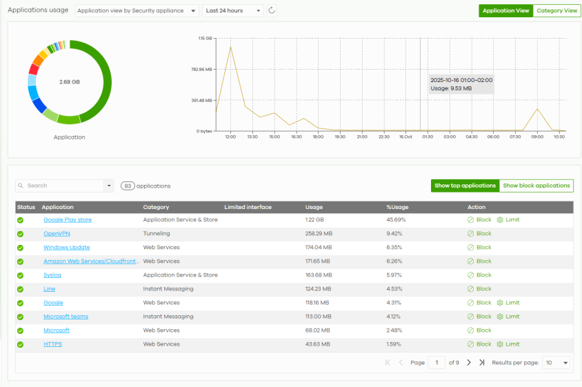 Action | Click Block to prevent usage of this application. Click Unblock to allow usage of this application. Click Limit to set the bandwidth for the application on the site’s gateway. You can apply the restrictions per gateway interface, or for all interfaces. |