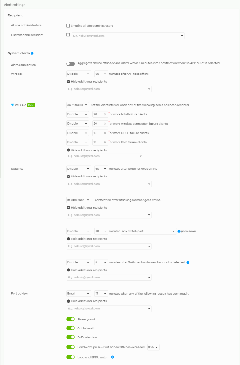 Switches | Specify how long in minutes (5/10/15/30/60) the NCC waits before generating and sending an alert when a port or a Switch or a stacking member goes offline, when the Switch temperature rises above the threshold, or the fan is functioning above the normal speed. For each alert, you can set how to receive alert notifications: • Email: Alert notifications are sent by email to configured administrators, custom email recipients, and additional recipients. • In-app push: Alert notifications are sent to site administrators who are logged into the Nebula Mobile app. This type of notification is not available for some features. • Both: Alert notifications are sent by email and app notification. • Disable: No alerts are sent. |