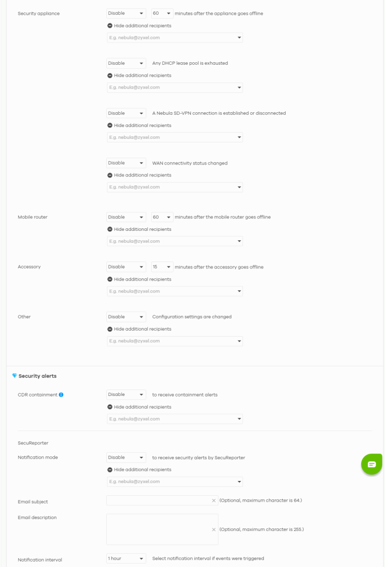 Security Appliance | Specify how long in minutes (5/10/15/30/60) the NCC waits before generating and sending an alert when a Security Appliance goes offline, there are more requests for IP addresses than what is available in the pool, a VPN connection is established or disconnected, or the WAN connection status has changed. For each alert, you can set how to receive alert notifications: • Email: Alert notifications are sent by email to configured administrators, custom email recipients, and additional recipients. • In-app push: Alert notifications are sent to site administrators who are logged into the Nebula Mobile app. This type of notification is not available for some features. • Both: Alert notifications are sent by email and app notification. • Disable: No alerts are sent. |