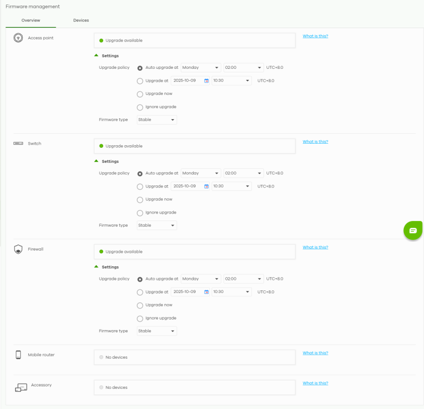Settings | Create a schedule for each Nebula Device type. The following Upgrade policy are available: • Select Auto upgrade at to create a recurring schedule. With a recurring schedule, NCC will check and install the firmware when a new firmware release is available for each Nebula Device type. • Select Upgrade at to install the firmware at a specific date and time (up to 1 month from now) when firmware update is available for each Nebula Device type. This field’s setting will change to the Auto upgrade at schedule after performing the firmware update. • Select Upgrade now to immediately install the firmware for each Nebula Device type. Then select the Firmware type (Stable or Latest (default)). • Select Ignore upgrade if you choose not to install the firmware. When the schedule for Auto upgrade at is earlier than the mandatory upgrade schedule, then the Auto upgrade at schedule has priority. |