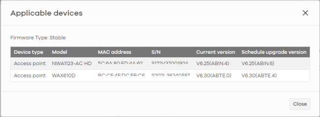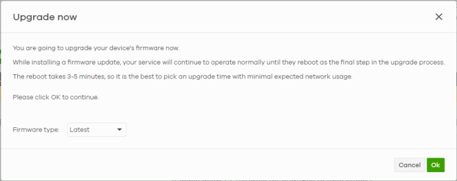 Upgrade Now | Click this to immediately install the firmware on the selected Nebula Devices. This button is selectable only when there is firmware update available for all the selected Nebula Devices. Then, select the Firmware type to be installed. • Select Stable to install a firmware that may not have the latest features but has passed Zyxel internal and external testing. • Select Latest to install the most recently release firmware with the latest features, improvements, and bug fixes. ![]() |