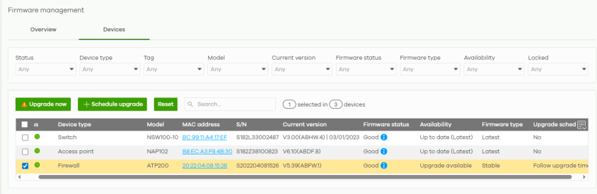 Firmware status | The status shows Good if the Nebula Device is running a Stable / General Availability / Latest firmware type. The status shows Warning if the Nebula Device is running a firmware type older than Stable, a newer firmware is available, and immediate action is recommended. The newer firmware may contain security enhancements, new features, and performance improvements. The status shows Critical if the Nebula Device is running a firmware type older than Stable, a newer firmware is available, and immediate action is required. The firmware may have security vulnerabilities and/or lack key performance improvements. The status shows Custom if the Nebula Device is running a firmware with specialized features that is not available to the general public. The status changes to Upgrading... after you click Upgrade Now to install the firmware immediately. |