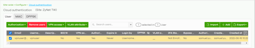 VPN access | Select one or more than one user account and click this button to configure whether the accounts can be used to connect to the organization’s networks through VPN. |