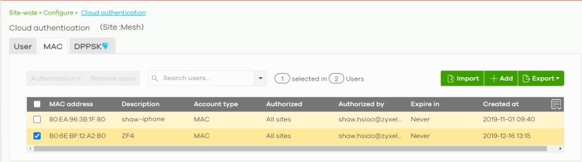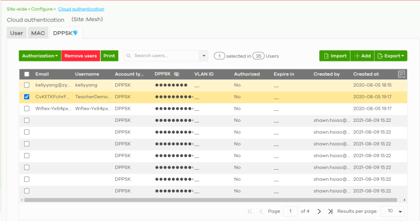 Add | Click this button to create a new user account. See Cloud Authentication DPPSK Screen. |