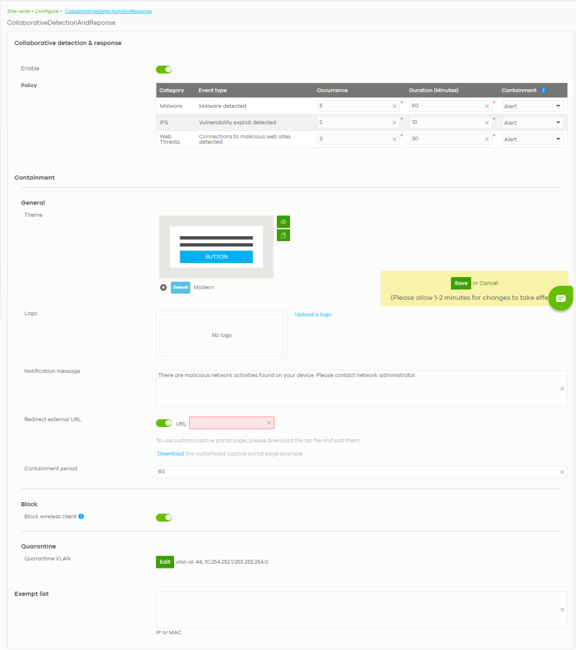 With Nebula Base/Plus Pack | CDR will not function. CDR settings will be grayed-out. | User is notified that CDR is with partial functionality only. • CDR event detection is available • CDR triggered events are logged in the Site-wide > Monitor > Site features logs • Containment actions (Alert/Block/Quarantine) is not available • Previously blocked/quarantined clients will be released in Site-wide > Monitor > Containment list. | CDR will disable its full functionality. • CDR fields in an “Enabled/Disabled” state will show “Enabled/Disabled” but grayed-out. • The Policy rule settings, Quarantine VLAN, and Exempt list will be kept in Site-wide > Configure > Collaborative detection & response. • Previously quarantined clients will be released. |