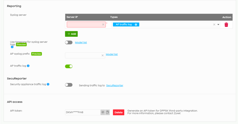 API access | API access allows third-party software to integrate with the DPPSK feature in NCC. For more information, please contact Zyxel. |
