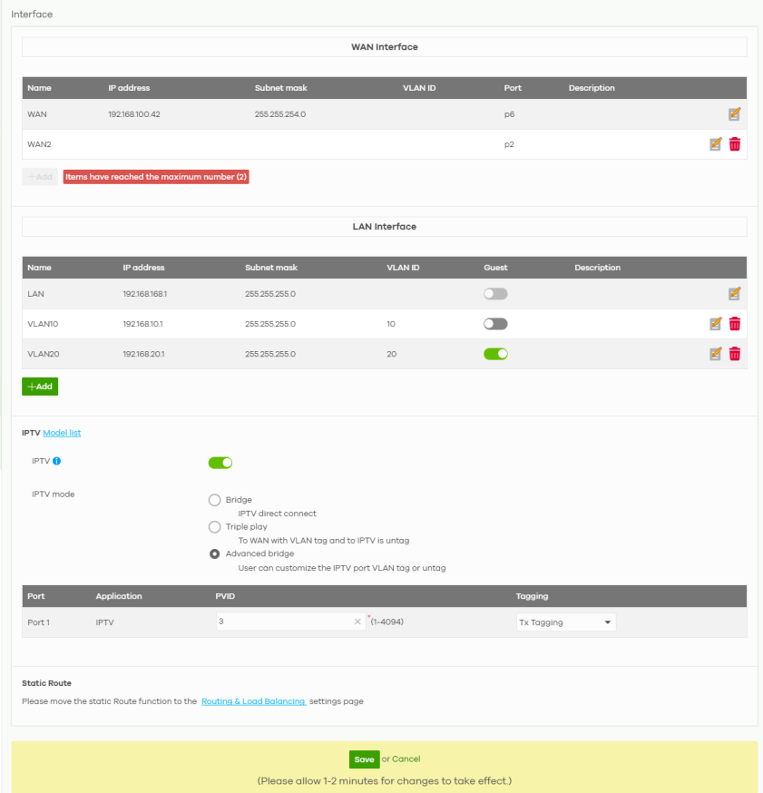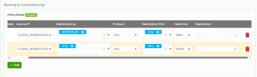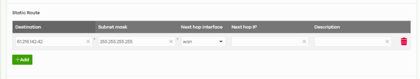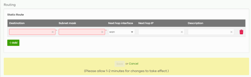 +Add | Click this button to create a new static route, maximum up to 20. |
