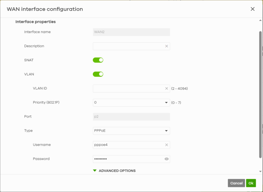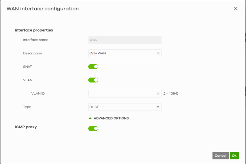 Description | Enter a description of the WAN interface here. You can use alphanumeric and ()+/:=?!*#@$_%– characters, and it can be up to 512 characters long. |