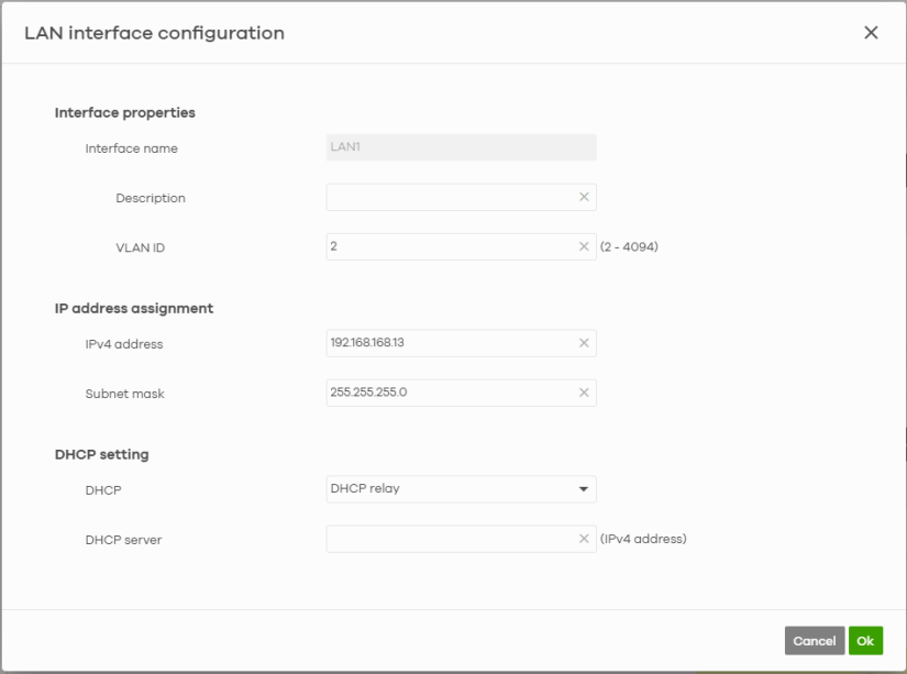 Description | Enter a description of the LAN interface here. You can use alphanumeric and ()+/:=?!*#@$_%– characters, and it can be up to 512 characters long. |