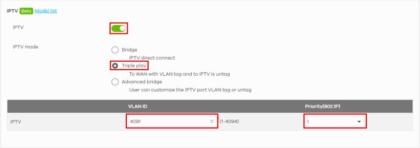 IPTV | Click the switch to the right to turn on the IPTV (Internet Protocol Television) service. IPTV is a service that delivers video traffic over an Internet Protocol (IP) network connection. |