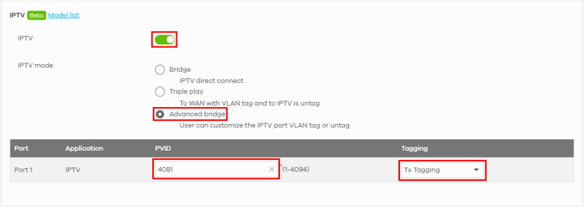 Tagging | This field is available only when the IPTV mode is set to Advanced bridge. Select Tx Tagging for the connected manageable Switch to forward IPTV-tagged traffic to the subscribers. If you do not have a connected manageable Switch, select Tx Untag or select Bridge mode in IPTV mode. |