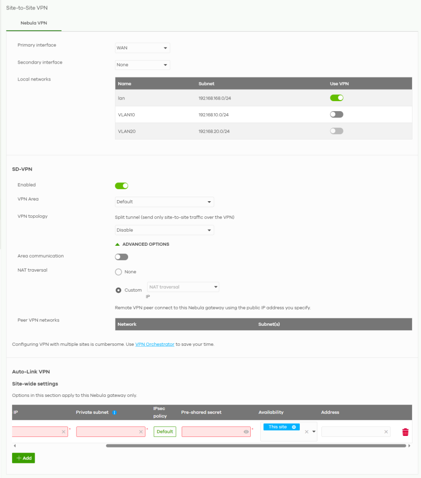 SNAT | Select this to enable SNAT. When enabled, the Nebula Device rewrites the source address of packets being sent from this interface to the interface's IP address. |