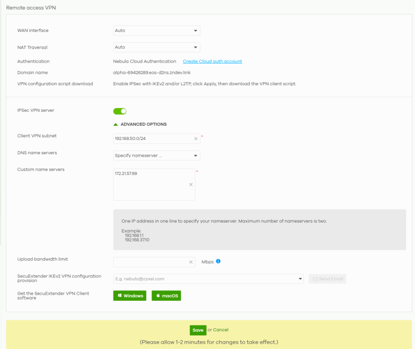 DNS server | Enter a DNS server's IP address. The Domain Name System (DNS) maps a domain name to an IP address and vice versa. The Nebula Device uses the first and second DNS servers, in that order to resolve domain names for VPN, DDNS and the time server. Leave the field blank if you do not want to configure DNS servers. |