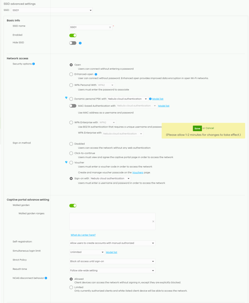 NCAS disconnect behavior | This field is available only when: • you set Sign-in method to Sign-on with Nebula Cloud authentication • you enable MAC-based Authentication with and you select Nebula cloud authentication Select Allowed to allow any users to access the network without authentication when the NCAS (Nebula Cloud Authentication Server) is not reachable. Select Limited to allow only the currently connected users or the users in the white list to access the network. |