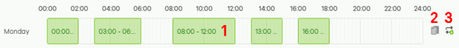 Schedule template | Select a pre-defined schedule template to configure the day and time at which the SSID is enabled or disabled: • Available 8–5 daily • Available 8–5 daily except weekends • Weekdays only • Always on • Always off Or select Custom schedule. For example, to enable the SSID on Monday: 08:00 to 12:00, click the 08:00 to 10:00 block and drag the right corner to include the 10:00 to 12:00 block (1). Click the Copy icon (2) to copy Monday’s schedule by selecting the day(s) of the week on the Copy schedule to window that appears. Click Apply to confirm. To set multiple SSID schedules, click the Repeat icon (3) to set the Time range, Allowed period and Disabled period on the Add repeated slots window that appears. Click Apply to confirm. ![]() You can click the block (1) to change the Start and End or select All Day on the Edit time window that appears. Click Save to confirm. Click Delete to remove the schedule. |