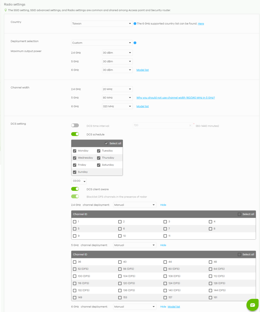 Maximum output power | Selecting any of the options in the Deployment selection field will automatically set the maximum output power for 2.4 / 5 / 6 GHz. But you can change the setting (1 to 30 dBm). |
