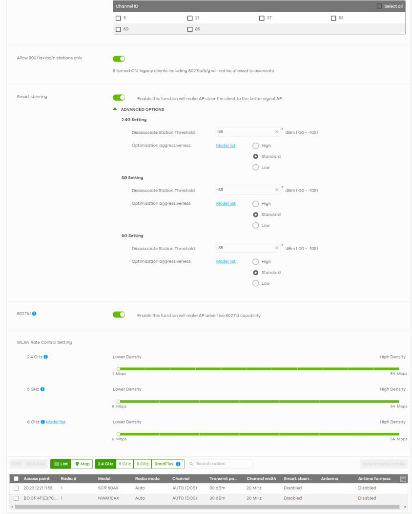 2.4 GHz / 5 GHz / 6 GHz | Sets the minimum data rate that 2.4 GHz, 5 GHz, and 6 GHz WiFi clients can connect to the Nebula Device, in Mbps. Increasing the minimum data rate can reduce network overhead and improve WiFi network performance in high density environments. However, WiFi clients that do not support the minimum data rate will not be able to connect to the Nebula Device. |