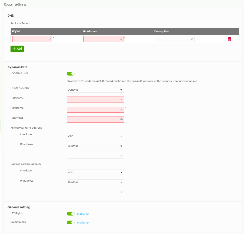 Primary binding address | Use these fields to set how the Nebula Device determines the IP address that is mapped to your domain name in the DDNS server. The Nebula Device uses the Backup binding address if the interface specified by these settings is not available. |